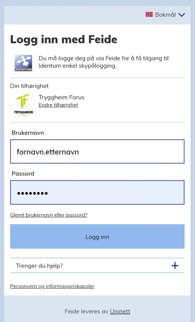 Ved Feide-pålogging velges «Tryggheim Forus» som tilhørighet/»kommune». Brukernavnet er kun fornavn.etternavn. (Jf bilde under)